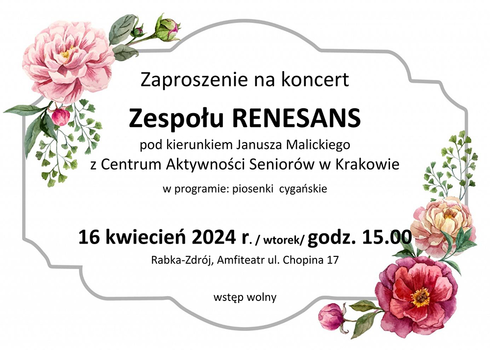 Centrum Kultury, Sportu i Promocji zaprasza 16 kwietnia (wtorek) o godz. 15.00 do Amfiteatru przy ul. Chopina 17 na koncert zespołu Renesans pod kierunkiem Janusza Malickiego z Centrum Aktywności Seniorów w Krakowie.