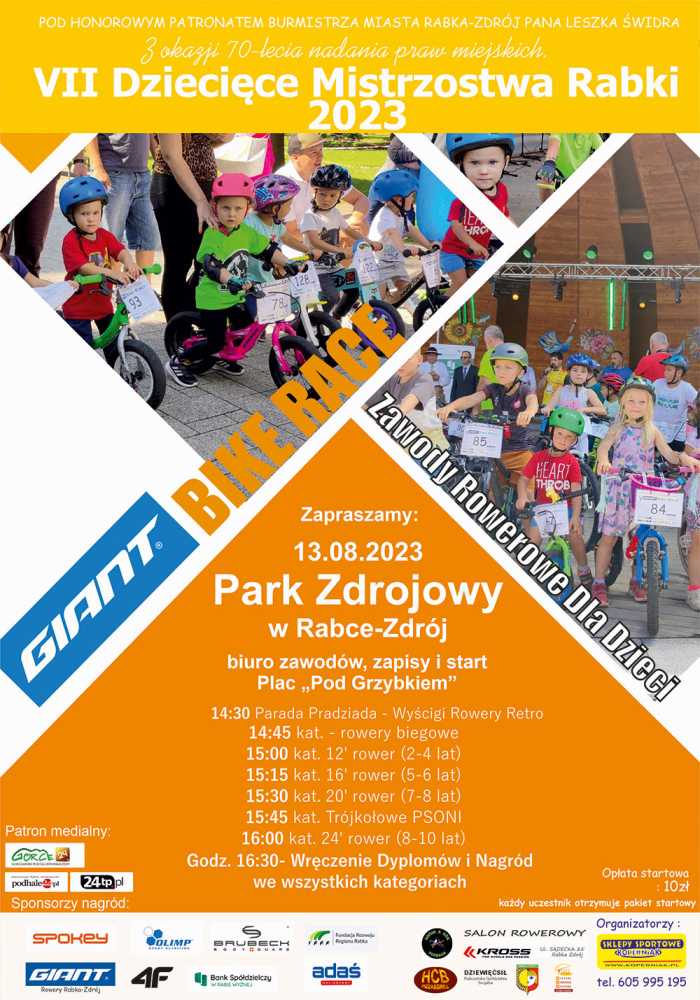 Będzie to siódma edycja zawodów rowerowych dla dzieci Giant Bike Race pod patronatem Burmistrza Miasta Rabki-Zdroju Leszka Świdra. Bazą startową będzie Park Zdrojowy, a dokładnie „Plac pod Grzybkiem”, gdzie umieszczony będzie start i meta dla naszych najmłodszych uczestników. Zawody rozegrane będą w 5 kategoriach ogólnych i dwóch specjalnych: Rowerek biegowy, koło 12 cali, koło 16 cali, koło 20 cali, koło 24 cele oraz rowery Trój-kołowe i przejazd paradny rowerów Retro. Zapisy będą przyjmowane w biurze zawodów od godziny 13.00, a start pierwszych uczestników przewidziany jest na godzinne 14.30.