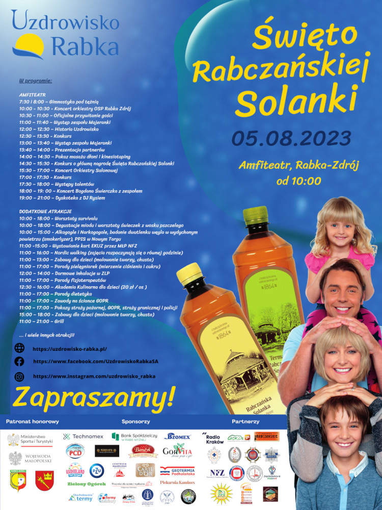 Organizatorzy przygotowali, głównie z myślą o przebywających w Rabce-Zdroju turystach i kuracjuszach m.in. takie atrakcje: porady fizjoterapeutów, dietetyka, badanie poziomu cukru; koncert zespołu Majeranki, Bogdana Świerczka, gry i zabawy dla dzieci; prezentacja straży pożarnej i GOPR. Można będzie się też dowiedzieć się o szerokim zastosowaniu, głównie do celów zdrowotnych i kosmetycznych, słynnej rabczańskiej solanki.