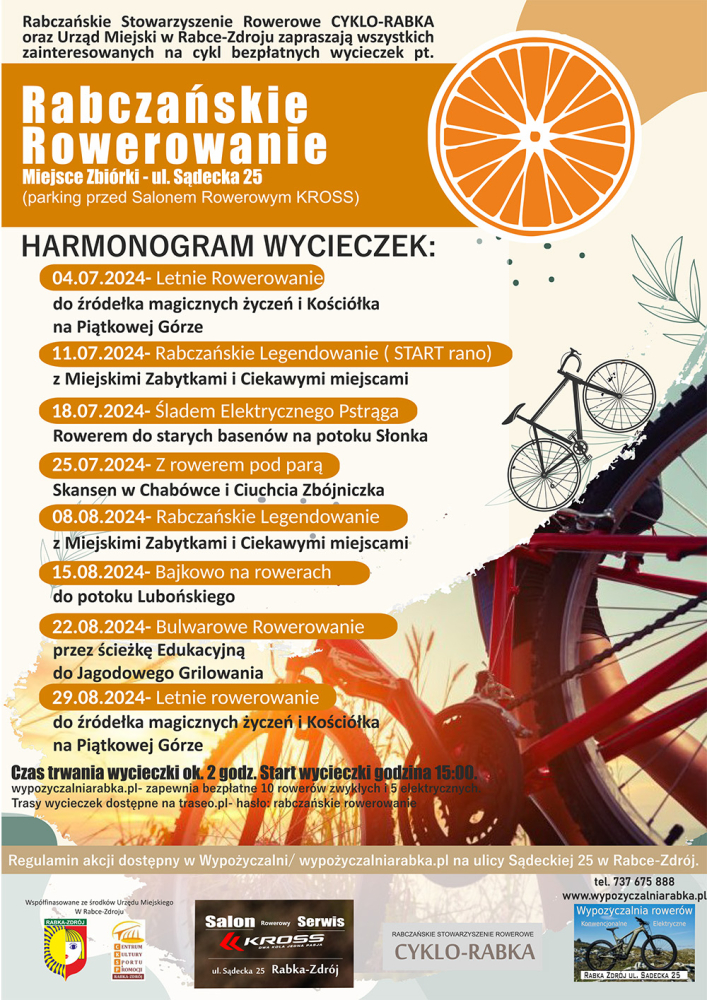 Stowarzyszenie Rowerowe Cyklo-Rabka organizuje cykl bezpłatnych wycieczek pt. „Rabczańskie Rowerowanie” dzięki wsparciu ze strony Wypożyczalni rowerów Elektrycznych MTB - WYPOŻYCZALNIARABKA.PL, Salonowi Rowerowemu Kross Rabka oraz pomocy finansowej Urzędu Miejskiego w Rabce-Zdroju. Wycieczki prowadzi wykwalifikowana kadra.