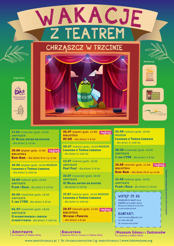 Na młodych widzów czekają emocje, przygody i mądra zabawa w przedstawieniach opartych na autorskich tekstach i z muzyką na żywo. Dzieci w wieku przedszkolnym i szkolnym zapraszamy do rabczańskiego amfiteatru, natomiast widzów jeszcze młodszych do Miejskiej Biblioteki Publicznej na wyjątkowe spektakle najnajowe. Ciekawych legendy związanej z regionem Rabki przywitamy w Muzeum Górali i Zbójników.