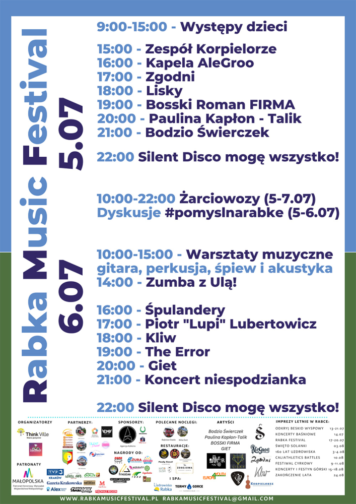 W programie m.in.: występy dzieci, warsztaty muzyczne, Zumba z Ulą, koncerty zespołów rockowych: Kliw, the Error, Giet. zespołów regionalnych: Korpielorze, Zgodni, Śpulandery. Występ Pauliny Kapłon-Talik i Bogdana Świerczka.